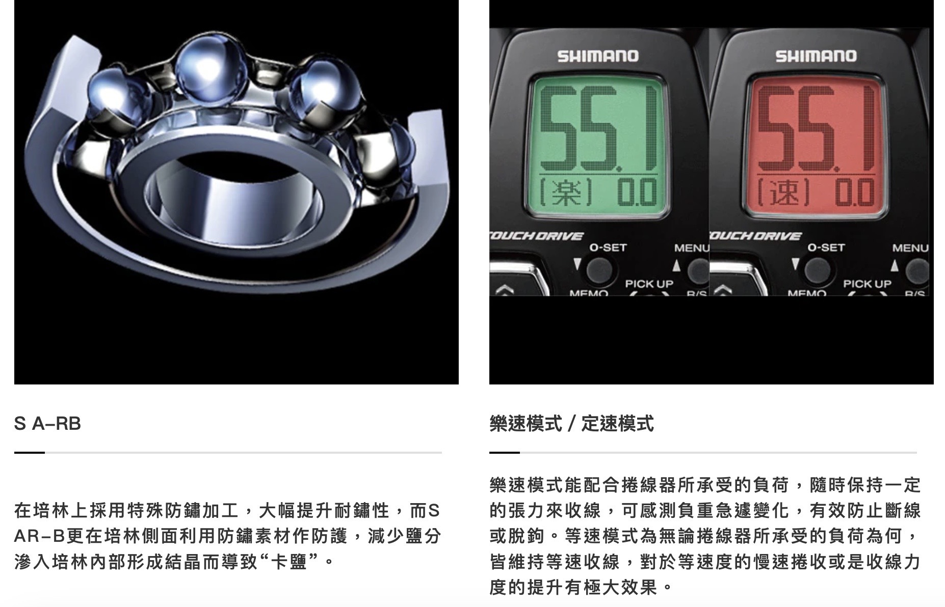 採用 Shimano 的防鏽 S A-RB 軸承技術,延長捲線器的使用壽命。這些軸承經過特殊處理,能有效防止鹽水侵蝕,適合長時間在海上使用,確保軸承持久順滑運作。
