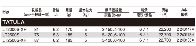 世界標準紡車式捲線器。在LT concept中純粹享受鱸釣的規格,並以此規格往上提升。具備輕量化線杯(AIR ROTOR)、自動拉力調節系統(ATD)、高強度齒輪(TOUGH DIGIEAR)、遠投線杯(LC-ABS)、高密度碳纖維機身(ZAION),凝聚了上述基本性能,搭配輕盈的手把迴轉的手感很好。隨心所欲地投出心裡所感受的極致。TATULA在紡車式捲線器中捲起了一股全新的旋風。