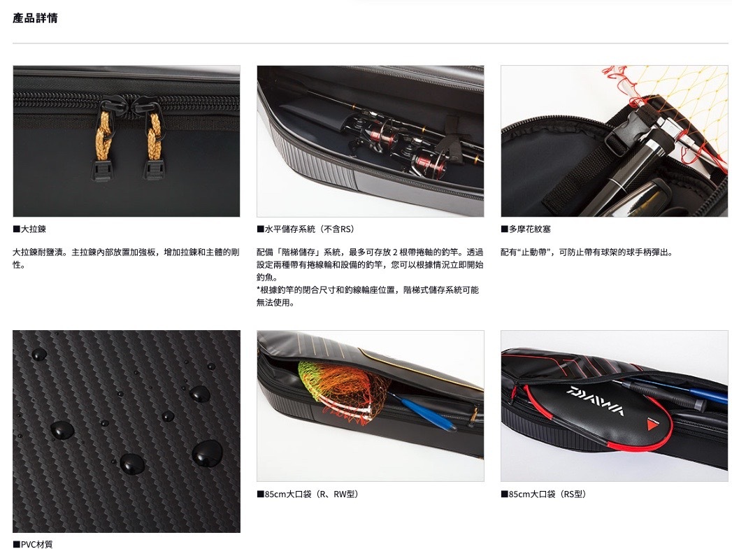 段差式收納設計(RS型除外)可容納2-3組帶捲線器的釣竿,另設有75cm餌勺收納區和85cm大型收納口袋。